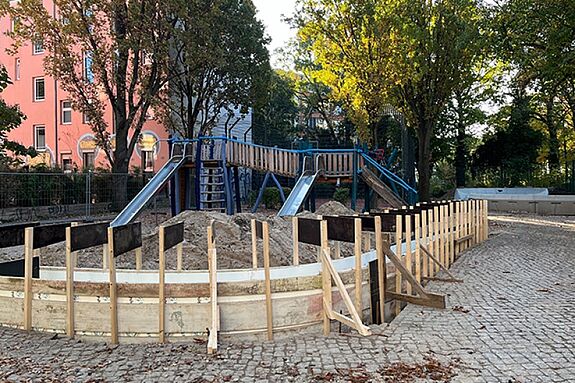 Ein Bauzaun trennt die bereits fertiggestellten Bereiche vom aktuellen Baugeschehen, sodass bestimmte Wege weiterhin genutzt werden können. Die Erneuerung setzt auf Nachhaltigkeit, indem nur defekte oder abgenutzte Teile ausgetauscht wurden – auf Wunsch der Anwohnenden bleiben die beliebten Elemente erhalten.