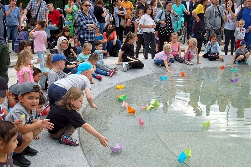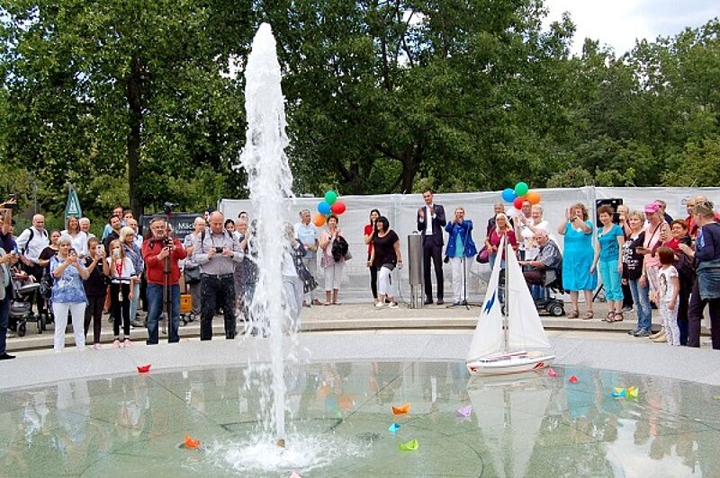 Der Bezirksbürgermeister Martin Hikel, die Bezirksstadträtin Karin Korte und die Beauftragte für Menschen mit Behinderung Katharina Smaldino hießen die 250 Festgäste willkommen. Anschließend wurden die kleinen Besucherinnen und Besucher dazu eingeladen, bunte Papier- und Modellschiffe zu Wasser zu lassen. Dann war es endlich soweit – Martin Hikel aktivierte per Knopfdruck die fünf Meter hohe Fontäne des Springbrunnes.