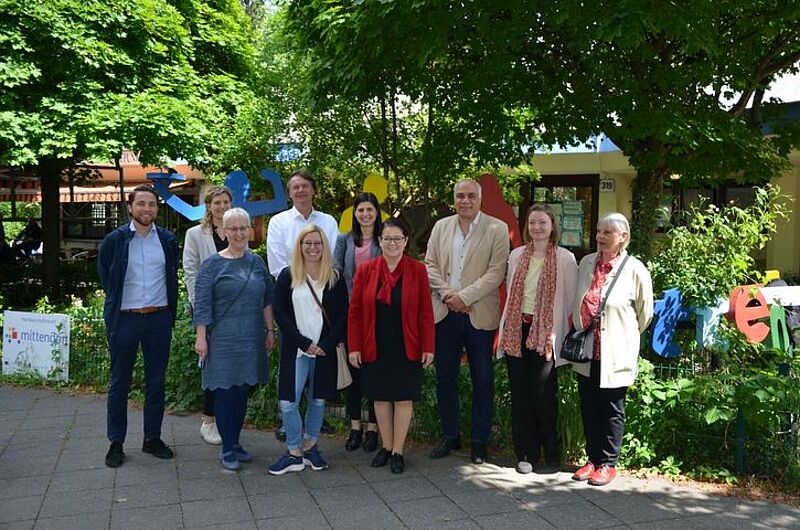 Der vom QM-Team organisierte Rundgang führte entlang von zehn Stationen durch das gesamte Gebiet und bot einen umfassenden Einblick. Nach einer einführenden Präsentation, in der die Situation im Quartier geschildert wurde, war die erste Station das „mittendrin“ selbst. Es ist das wichtigste Ankerprojekt im Gebiet mit unterschiedlichen Angeboten zur Verbesserung der multikulturellen Nachbarschaften. Direkt einbezogen: der ehrenamtliche „mittendrin“-Beirat. Nach Besichtigung des Spielegartens für Jung und Alt, einer gestalteten Freifläche für die angrenzende Kita und die Bewohnerschaft, machte die Gruppe sich bei sommerlichem Wetter auf den Weg.