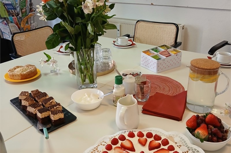 Die Quartiersmanagerinnen Katharina Zöller, Henriette Mögel und Lara Roeske haben Kuchen gebacken, geschmückt und eingedeckt. Zudem haben sie alles vorbereitet, um Handcreme aus natürlichen Zutaten herzustellen. Auch Blumen wurden zum Internationalen Frauentag an Passantinnen und Besucherinnen verteilt.