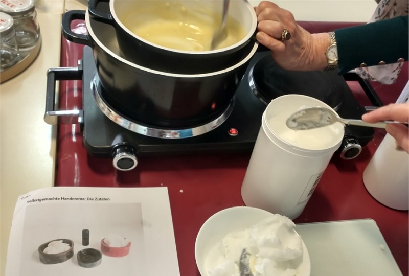 Besonders freute die Organisatorinnen, dass neben bereits im QM engagierten Anwohnerinnen auch einige neue Frauen ihren Weg in das Stadtteilbüro fanden. Das Ergebnis: selbstgemachte duftende Handcreme, anregende Gespräche und ein wohltuender Nachmittag.