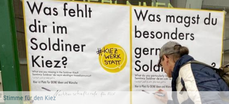 Sonst eine Präsenzveranstaltung wird die Kiezwerkstatt Corona-bedingt zur #kiezwerkstatt. Für die Diskussionen zu zukünftigen Entwicklungen im Soldiner Kiez hat das QM-Team neue Formate entwickelt. Denn: „Gerade in solchen Zeiten, in denen Zusammenhalt, Gemeinschaft und Solidarita?t ein hohes Gut sind – gleichzeitig soziale Ungleichheiten versta?rkt werden, viele vor diversen beruflichen und privaten Herausforderungen stehen und Beteiligungsmöglichkeiten sich erst einmal neu orientieren mu?ssen, ist uns der Austausch mit euch umso wichtiger", sagt das QM-Team.