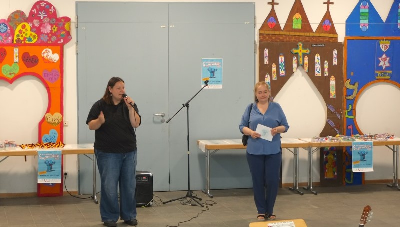 Zwei Frauen stehen bei der Superschüler*innen-Ehrung 2025 im QM-Gebiet Rollbergsiedlung vor einer bunt dekorierten Wand und sprechen ins Mikrofon.