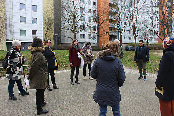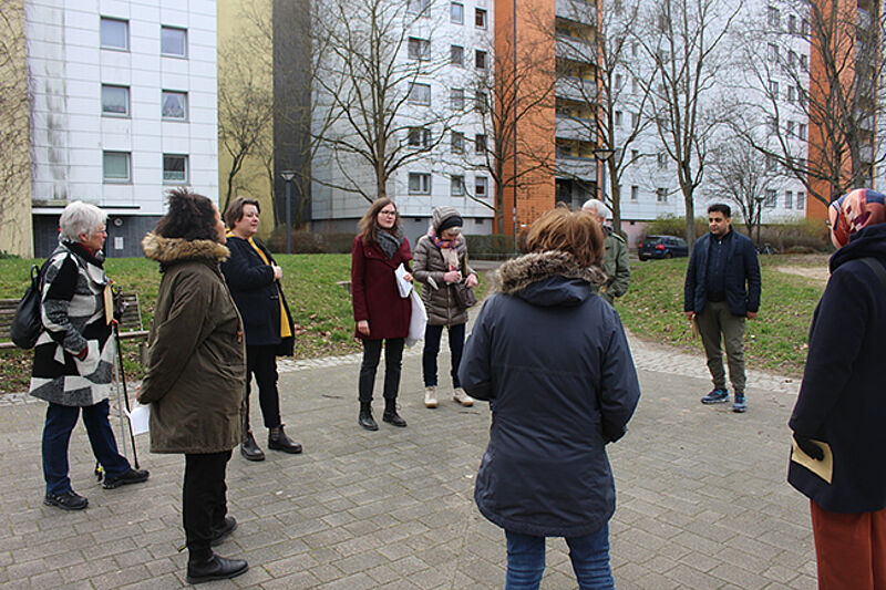 Den Spaziergang nutzten die Teilnehmenden auch zum Austausch. Heraus kam, was den Menschen an der Siedlung gefällt und was verbessert werden kann. Die meisten betonten die positiven nachbarschaftlichen Kontakte. Sie sagten aber auch, dass attraktive Spielplätze fehlen. Auch Bänke, auf denen sich ältere Menschen ausruhen können, gibt es zu wenige im Kiez.