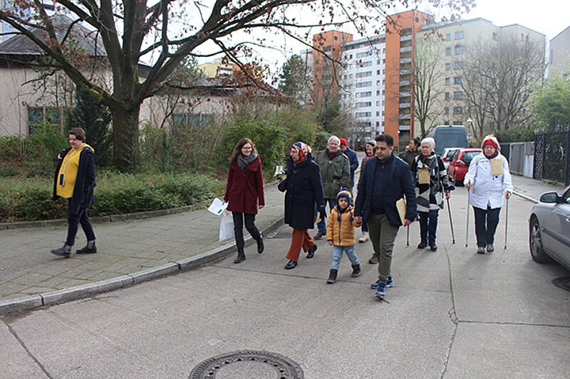 Lisa Stöcker vom Kieztreff Thermometersiedlung (Mitte) hatte viele interessante und neue Informationen für die Spaziergängerinnen und Spaziergänger recherchiert. (Bild: QM Thermometersiedlung)