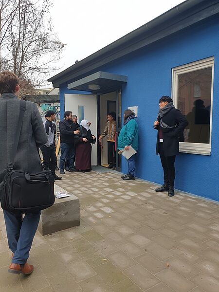 Eine Gruppe von Menschen steht vor dem Rahim-Yildirim-Haus, das gerade durch das Durchschneiden eines Bandes eröffnet wurde.