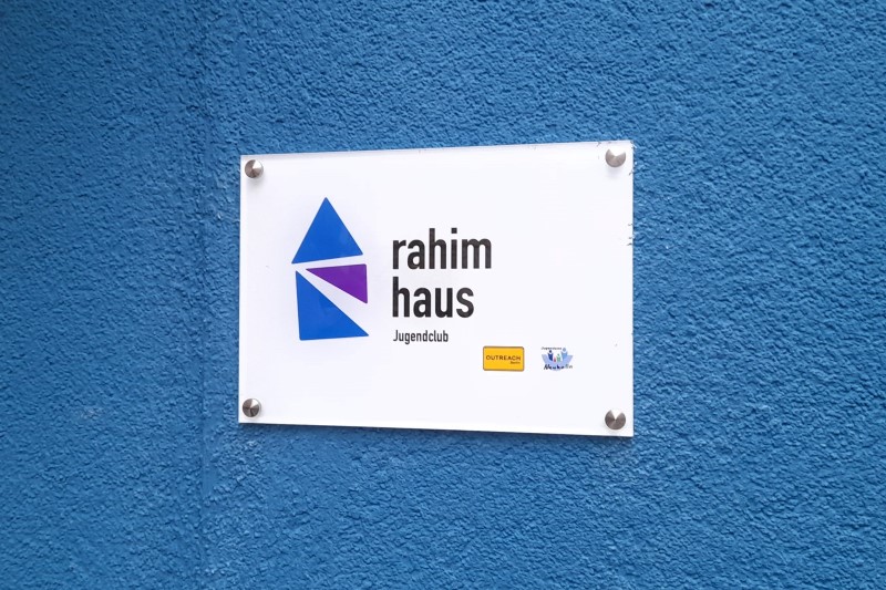 Auf der blauen Fassade ist ein Schild mit dem Namen des Jugendtreffpunkts Rahim-Yildirim-Haus angebracht.