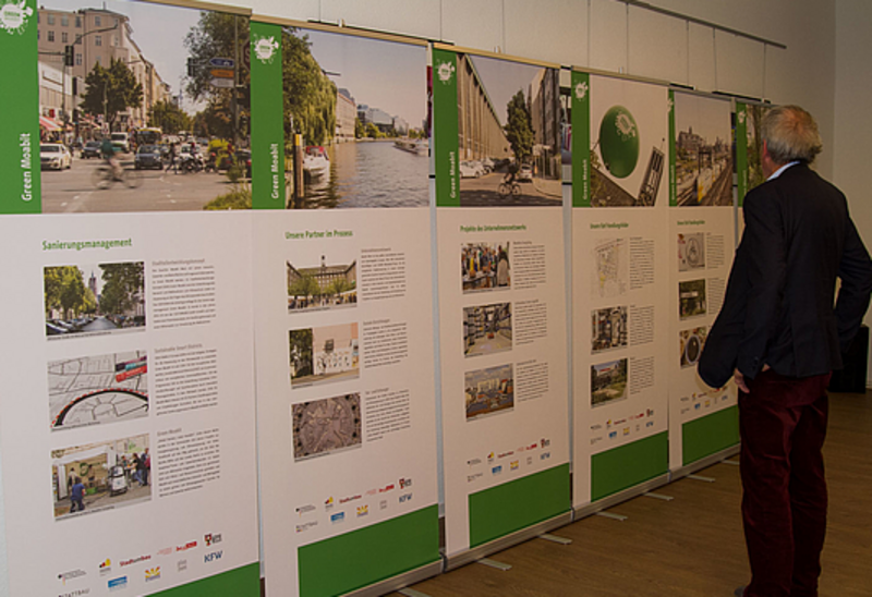 Eine Ausstellung in den neuen Räumen zeigt, worum es bei dem Konzept geht: Bis 2024 sollen bei den Indikatoren Energie, Abfall, Wasser, Mobilität, Bildung, öffentlichen Freiräumen und Umweltmanagement in Moabit-West deutlich bessere Werte erreicht werden. Durch die Vernetzung von Quartiersmanagement und Umweltbildung kommt man diesem Ziel deutlich näher.