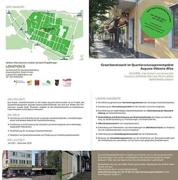 „Gewerbe unterstützen und entwickeln, Standort vermarkten und profilieren, Leerstände beheben“ – das ist der Leitsatz des Projektes „Gewerbenetzwerk im QM Auguste-Viktoria-Allee“. Seit Juli 2017 läuft das Projekt des Quartiersmanagements Auguste-Viktoria-Allee, finanziert aus Mitteln des Programmes „Soziale Stadt“. Ziel ist es, die Gewerbesituation im Quartiersmanagementgebiet zu verbessern. Dabei geht es besonders um die Vernetzung und Unterstützung der lokalen Gewerbetreibenden und die Vermarktung des Standortes – etwa um Leerstand entgegenzuwirken und neue Gewerbe anzulocken.