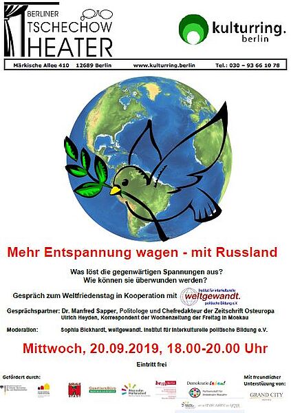Am Abend findet von 18 bis 20 Uhr im Tschechow-Theater ein Austausch zum Thema „Mehr Entspannung wagen - mit Russland“ statt. An der Diskussion beteiligen sich Dr. Manfred Sapper, Politologe und Chefredakteur der Zeitschrift „Osteuropa“, sowie Ulrich Heyden, Korrespondent der Wochenzeitung „Freitag“ in Moskau. Es wird geklärt, was die derzeitigen Spannungen mit Russland auslöst und wie diese überwunden werden können.