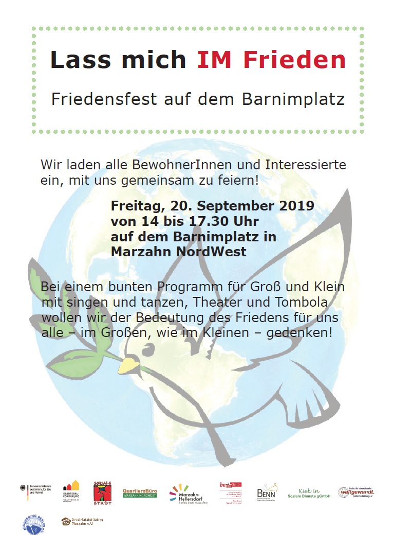 Am Nachmittag steigt von 14 bis 17:30 Uhr auf dem Barnimplatz ein Friedensfest zum Motto „Lass mich IM Frieden“. Bei einem vielseitigen Programm aus Tanz, Gesang, Theater und einer Tombola wird gemeinsam der Bedeutung des Friedens gedacht.