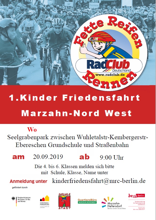 Im Quartier Marzahn-NordWest steht der 20. September 2019 von morgens bis abends im Zeichen des Friedens. Eingeläutet wird der Tag ab 9 Uhr mit der ersten Friedensfahrt durch den Kiez, bei der Schülerinnen und Schüler gemeinsam durch den Seelgrabenpark radeln. Schulklassen können sich unter kinderfriedensfahrt@mrc-berlin.de im Vorfeld für die Tour anmelden.