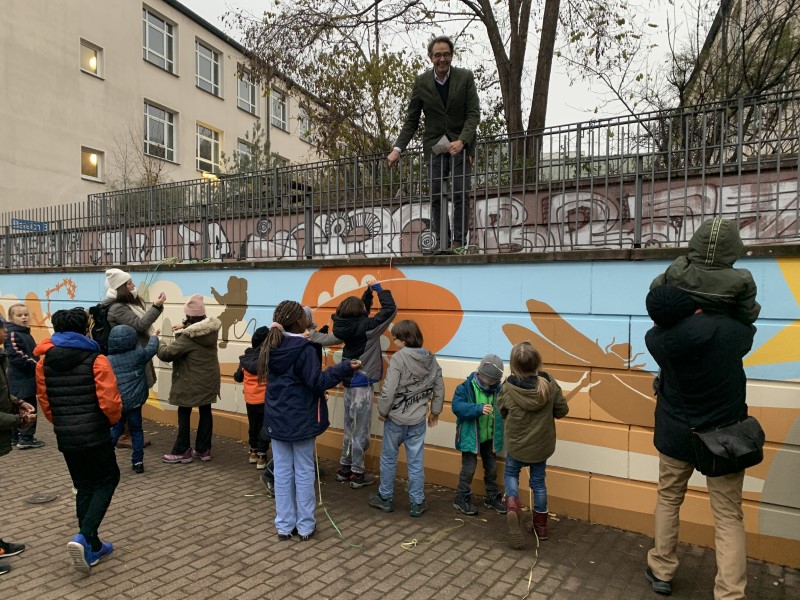 Um die Fertigstellung der ersten bemalten Wand zu feiern, kamen viele Gäste in die Schule – darunter Candy Hartmann vom QM, einige Mitglieder des Quartiersrats sowie Kinder und Fachkräfte aus der Schule. Einer der beiden Künstler war ebenso dabei wie Anette Nägele und Jenny Howald vom „Team Bildung in Bewegung“, die das Projekt betreuen.
