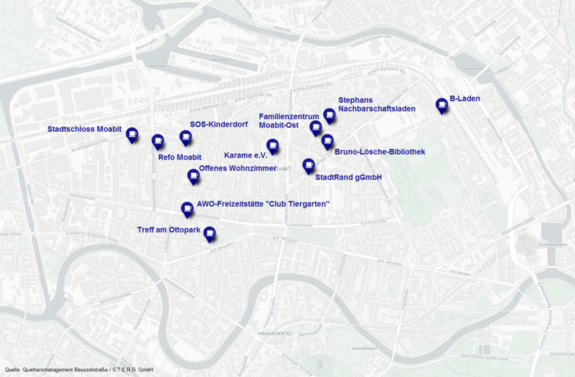 Neu war diesmal auch die Form des Plenums. Es gab einen messeartigen Aufbau mit mehreren Tischen der einzelnen Moabiter Institutionen, an denen diese sich den Plenumsgästen vorstellten. Esther Klobe-Weihmann vom Moabiter Ratschlag e.V. lud als Moderatorin alle Beteiligten zu einem Rundgang durch Moabit zu den „warmen Orten“ ein. Dabei handelt es sich um Einrichtungen, die Teil des Projekts „Netzwerk der Wärme“ sind.