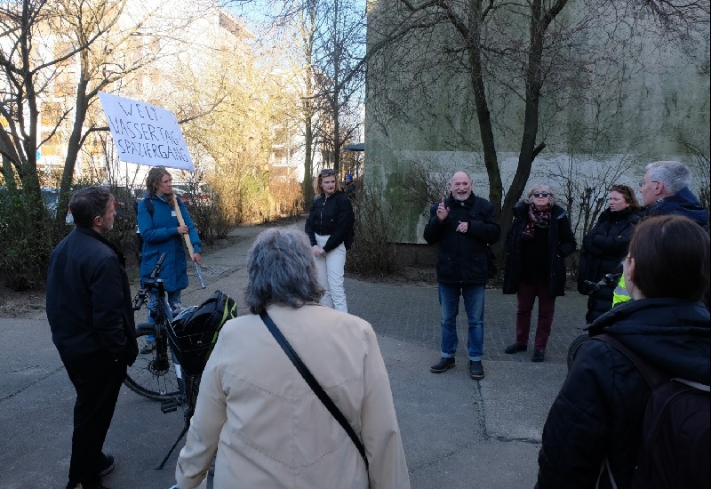 Am 18. März 2022 führte er eine Gruppe interessierter Nachbarinnen und Nachbarn durch den Kiez, um auf die kostbare Ressource Wasser aufmerksam zu machen. Unter den Teilnehmenden waren auch Vertreterinnen und Vertreter von Umweltinitiativen, jeweils zwei Vertreterinnen der Wohnungswirtschaft mit Beständen im Quartier, der Leiter des bezirklichen Straßen- und Grünflächenamtes sowie die zuständige Referentin für Städtebauförderung des Bezirksamts. Sogar ein Wasserbau-Ingenieur aus Frankfurt/Oder war dabei.