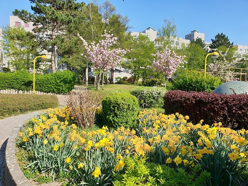Narzissen, Forsythien, Zierquitten und Mahonien locken im Quartier High-Deck-Siedlung bei frischer Luft und viel Sonnenschein vor die Haustür. Viel Grün und üppige Blütenprachten gibt es unter anderem im Schulenburgpark, entlang des Heidekampgrabens aber auch am Mauerradweg zu entdecken.