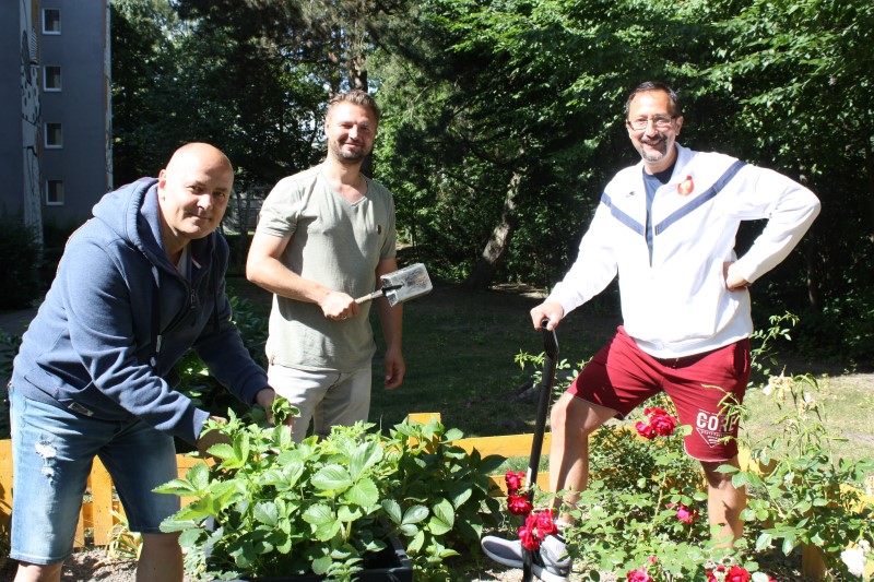 Aber von vorne: 2017 begann Mario Kübler, Anwohner des 80er-Blocks der Wohnungsgesellschaft degewo und damit unmittelbarer Nachbar von Bernd Schumann und Holger Schwabe, ein Beet vor seiner Haustür anzulegen. Der Grund: die starke Vermüllung vor den Häusern entlang der Pechsteinstraße. Schnell war das Interesse der Nachbarinnen und Nachbarn geweckt. Vor allem mit Beginn der Corona-Pandemie 2020 begeisterten sich viele männliche Bewohner des Blocks für das Vorhaben.