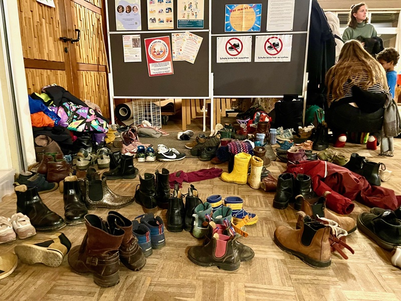 Klare Regeln: Damit alle Freude an dem Winterspielplatz haben, werden die Schuhe vor Spielbeginn ausgezogen. (Bild: H. Heiland)