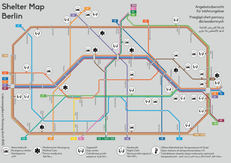 Wegen der hohen Nachfrage wurde die „Shelter-Map“ im November 2018 vom Quartiersmanagement Wassertorplatz neu aufgelegt. Übersichtlich bildet die Karte Notunterkünfte, medizinische Versorgungsmöglichkeiten sowie Nachtcafés in Berlin ab. Anhand eines U-Bahn Plans können die Hilfesuchenden die nächstgelegenen Angebote finden. Ein Verzeichnis gibt Informationen zu den Adressen, Verkehrsanbindungen und Öffnungszeiten.