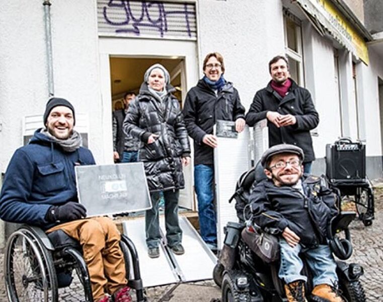 Aktivist Raul Krauthausen (vorne rechts) freut sich zusammen mit Bezirksstadtrat Jochen Biedermann (hinten Mitte) und den Anwohnern über die neuen Rampen. Foto: AG.URBAN und Jörg Farys, die projektoren