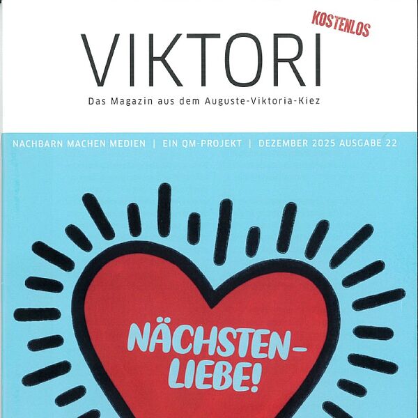 Die neue „Viktori“ widmet sich dem Schwerpunkt „Nächstenliebe“ und greift viele Themen auf, die den Auguste‑Viktoria‑Kiez aktuell beschäftigen. Die Kiezzeitung berichtet unter anderem über den neu gewählten Quartiersrat, die Umgestaltung des Rosengartens, den Ausbau der Fernwärme sowie Projekte wie das ukrainisch-deutsche Sprachcafé, Hip-Hop-Veranstaltungen, Urban Gardening im Gemeinschaftsgarten oder neue Musik- und Kreativangebote im Kiez.