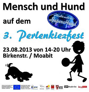 In Berlin-Moabit findet am 23.08.2013 der Aktionstag "Mensch und Hund" statt. Im Rahmen des 3. Perlenkiezfestes soll der Dialog zwischen Hundehaltern und Nicht-Hundehaltern verbessert werden.