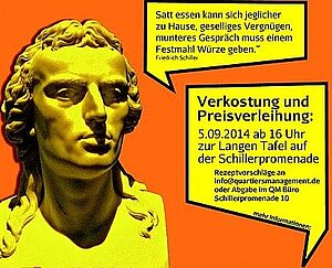 Die Speisen werden am 05.09.2014 bei der "Langen Tafel" auf der Schillerpromenade verkostet, die Preisverleihung findet um 17.30 Uhr statt. Der Neuköllner Bundestagsabgeordnete Fritz Felgentreu verleiht den “Goldenen Schiller 2014“, nachdem die Teilnehmerschaft der langen Tafel über den Sieger entschieden hat.