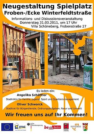 In Anwesenheit der für das Quartiersmagement zuständigen Stadträtin Angelika Schöttler und des für den Fachbereich Natur und Umwelt zuständigen Stadtrats Oliver Schworck wird am 31. März um 17.00 Uhr in der Villa Schöneberg der Planungsentwurf für die Neugestaltung der Spielfläche entlang der Frobenstraße, zwischen Winterfeldt- und Bülowstraße, vorgestellt.