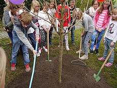 Die nächsten Schritte hin zur Quartiersschule sind ebenfalls geplant: Symbolisch pflanzten die Schulkinder während des Festes einen Pflaumenbaum für den geplanten Schulgarten. Mit Mitteln aus dem Baufonds des Programms Soziale Stadt wird außerdem der Schulhof neu gestaltet.