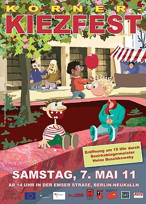 Das Kiezfest, das von 14 Uhr bis 20 Uhr stattfindet, wird zahlreiche Einrichtungen und Akteure aus dem Gebiet (Schulen, Kitas, soziale und kulturelle Projekte, lokales Gewerbe) mit unterschiedlichen Beiträgen (Bühnenauftritte, Stände) präsentieren. Es bietet den Beteiligten und den Besuchern des Festes eine gute Gelegenheit, die interkulturelle Vielfalt des Körnerkiezes kennenzulernen.