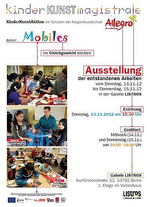Unter dem Motto "Mobiles – Im Gleichgewicht bleiben" werden vom 13.11.2012 bis zum 15.11.2012 die Arbeiten von Nachwuchskünstlerinnen und -künstlern in einer Ausstellung gezeigt. Die Aktion ist Teil des Projekts "kinderKUNSTmagistrale" und findet in Kooperation mit der Allegro-Grundschule statt.