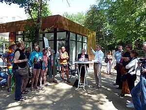 Der Pavillon dient als Servicestation für die angrenzende Minigolfanlage. Auch kleine Snacks und ein WC werden hier in Zukunft angeboten. Ab 1. Juli kann bis zum Ende der Sommerferien nachmittags kostenlos Minigolf gespielt werden. Das Bezirksamt und der Betreiber Bildungsmarkt e.V. wollen damit allen Familien im Quartier ermöglichen, die Anlage zu nutzen. Auch in der Schulzeit kann hier zu sehr kleinen Preisen gespielt werden.