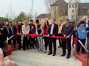 Die Schülerinnen und Schüler waren von Beginn an bei der Umgestaltung der Schulfreifläche dabei. Eine Lärmschutzwand sorgt nun für einen ruhigeren Schulhof. Außerdem gibt es neue Bänke, eine veränderte Struktur des Hofs und ein Ballspielfeld. Das Projekt wurde mit Mitteln aus dem Programm "Soziale Stadt" durchgeführt. Die Fördersumme betrug rund 670.000 Euro.