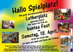 Die Luthergemeinde im Quartier Spandauer Neustadt lädt am 13.04.2013 zur Eröffnung des neugestalteten Kleinkinderspielplatzes auf dem Lutherplatz ein. Das Einweihungsfest des Kinderspielplatzes beginnt um 12 Uhr. Die Besucherinnen und Besucher werden gebeten, sich am Büffet zu beteiligen. Spielideen oder Vorschläge für das Programm sind ebenso willkommen und werden vom Büro der Luthergemeinde entgegengenommen.