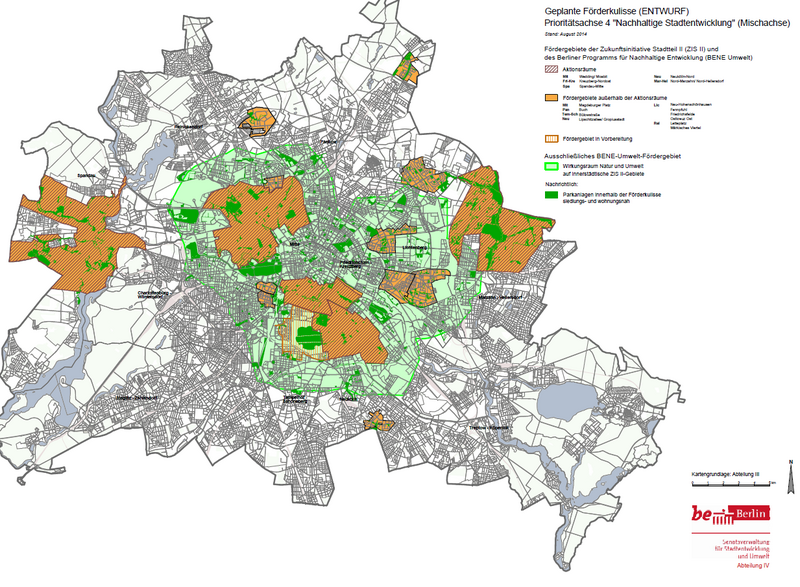 Für das Teilprogramm „Bildung und Integration im Quartier“ gibt es von 2014 bis 2020 rund 17,5 Millionen Euro aus dem Europäischen Fonds für regionale Entwicklung (EFRE) – also voraussichtlich rund 2,5 Millionen Euro pro Jahr. Gefördert werden Projekte, die innerhalb der sogenannten ZIS-II-Förderkulisse liegen. Dazu gehören unter anderen die Berliner Quartiersmanagementgebiete und die Aktionsräume (siehe Karte).