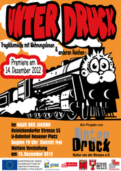 Der Verein "Unter Druck e. V. - Kultur von der Straße" präsentiert am 14.12.2012 und 15.12.2012 die Ergebnisse eines Theaterprojekts für Wohnungslose im Quartier Pankstraße (Reinickendorfer- / Pankstraße). Die Aufführungen im "Haus der Jugend" Reinickendorfer Straße beginnen jeweils um 19.00 Uhr.