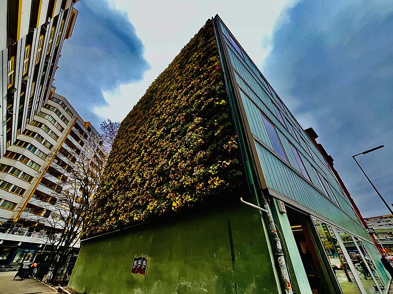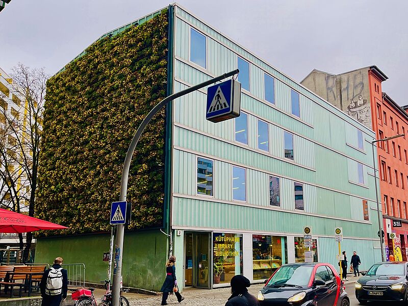 Grundlage für die Planung war die Machbarkeitsstudie „Fassadenbegrünung für ausgewählte bezirkliche Gebäude“ im Auftrag des Bezirksamt Friedrichshain-Kreuzberg/ Amt für Bibliotheken. Die dann mit Mitteln aus dem Baufonds umgesetzte Maßnahme ist die erste grüne Fassade an einer öffentlichen Bibliothek in Berlin. Ein gutes Beispiel, das zur Nachahmung einlädt.