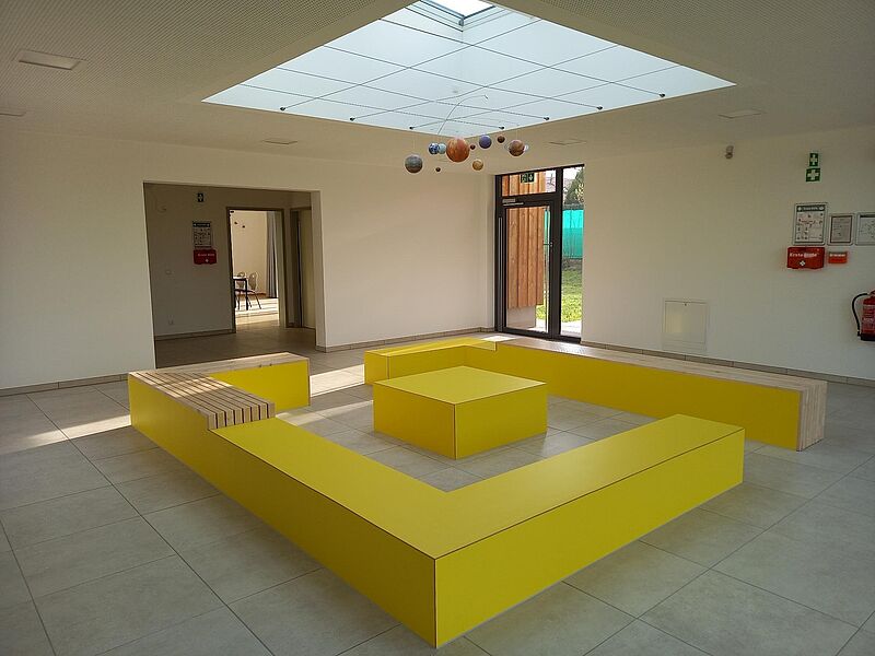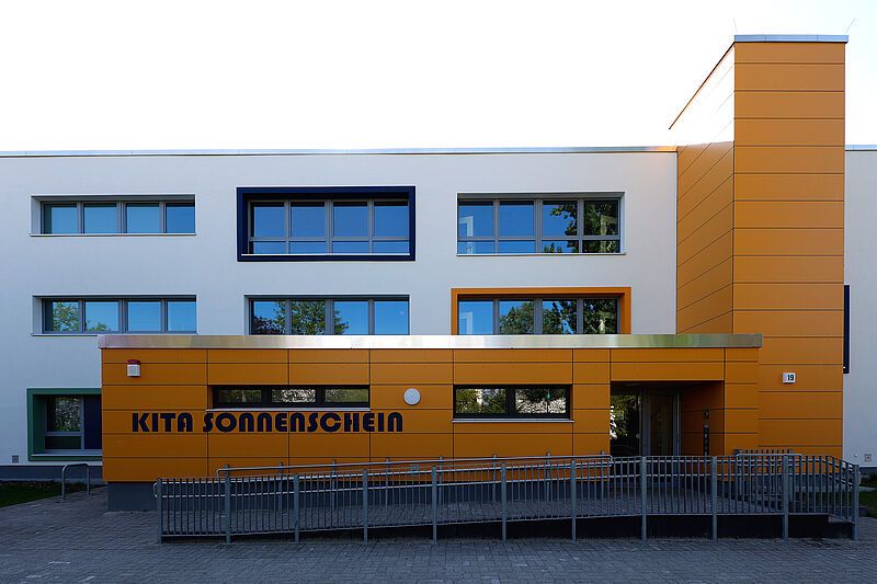 Die Anfang der 1990er Jahre gebaute Kita Sonnenschein hielt den Anforderungen an den Kitabetrieb und dem Bedarf im Quartier nicht mehr stand – weder qualitativ noch bezüglich der Aufnahmekapazitäten. Die Integrationskindertagesstätte sollte nach aktuellen Standards erneuert, die Außenanlagen aufgewertet werden. Doch im Quartier dachte man gleich weiter: Neben zusätzlichen Räumen für einen erweiterten Kitabetrieb war es ebenso Ziel, Raum für den Austausch mit und zwischen Eltern und für die Nachbarschaft zu schaffen. Damit wird der Standort nicht „nur“ seiner Funktion als moderne Kindertagesstätte gerecht, sondern bietet dem Quartier auch einen neuen nachbarschaftlichen Begegnungsort. Eine Mehrfachnutzung also. Mit Hilfe gebündelter Mittel aus dem Baufonds des Programms Sozialer Zusammenhalt und dem Investitionspakt Soziale Integration im Quartier konnte diesem Ziel gemäß die umfassende Sanierung des Bestandsgebäudes sowie der Erweiterungsbau (Sonnenatrium) ermöglicht werden. Durch den integrativen Ansatz der Kita und die baulich geschaffene Barrierefreiheit wird die Kita Sonnenschein in Zukunft im Bereich der Inklusion einen wichtigen Beitrag leisten können, da es bis dato im Ortsteil keine komplett barrierefreie Kita gab.