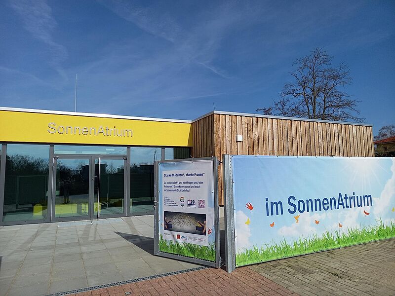 Im Mai 2023 am Tag der Städtebauförderung wurde die Kita Sonnenschein im Kosmosviertel mit einem Nachbarschaftsfest feierlich neu eröffnet und erstrahlt seitdem in neuem Glanz. Das gesamte Gebäude wurde saniert und ausgebaut: Fenster und Türen sowie die Dämmung des Gebäudes wurden erneuert, zusätzliche Bewegungsräume geschaffen und ein Aufzug für Kinder mit Mobilitätseinschränkungen ergänzt. Das Angebot der Kita wurde um 20 zusätzliche Plätze erweitert, sodass nun 200 Kinder versorgt werden können. Auf dem Gelände entsteht außerdem das neue Begegnungshaus „Sonnenatrium“, das u.a. die zuvor im Kitagebäude befindliche Sauna mit Kneippbecken und eine Familienküche, Mehrzweckräume für Sport- und Bewegungskurse und Veranstaltungen sowie ein Atrium für kulturelle Veranstaltungen integriert. Dadurch werden zahlreiche neue Nutzungsmöglichkeiten für barrierefreie Bewegung, Bildung, Kultur, Spiel und Gesundheitsförderung geschaffen. Das Haus soll bis zum Mittag von den Kitakids genutzt werden und steht anschließend der Nachbarschaft offen. Der Träger der Kita FiPP e.V. hatte bereits im Vorfeld Ideen in der Nachbarschaft gesammelt, wofür diese neuen Räume im Quartier genutzt und mit Leben gefüllt werden könnten. An Einfällen und Wünschen mangelte es nicht. Die Bandbreite reicht von Sport über Theatervorführungen und Lesungen bis zu Kochkursen. Seit März 2024 findet das Projekt „Starke Mädchen, starke Frauen“ im Sonnenatrium Platz. Die weitere Nutzung wird zurzeit geplant und abgestimmt.