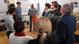 Mehrere Personen sitzen an einem großen Tisch und bedrucken Stoffbeutel mit buntem Herbstlaub. Auf dem Tisch liegen Farben, Pinsel, Walzen und bemalte Blätter.