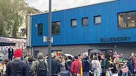 Beim Kiezfest im QM-Gebiet Flughafenstraße sitzen Personen an Tischen oder stehen vor der Bühne.