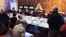 Zwei Personen aus dem Team stehen in der Stadtteilbibliothek neben einer Präsentationsfolie mit dem Titel „Was machen wir?“ und erläutern ihr Angebot.