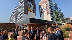 Berlins Regierender Bürgermeister Kai Wegner und seine Senatsmitglieder besuchten am 17. September 2024 das Gebiet des Quartiersmanagements (QM) Kosmosviertel. Bei einer Bezirkstour verschafften sie sich einen Eindruck von der lokalen Entwicklung.