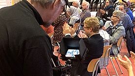 Menschen sitzen in einem Raum, während beim Nahariyaforum in der Nahariya-Schule eine Präsentation gehalten wird.