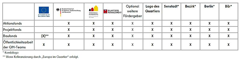 Die aktualisierten Logoleisten enthalten die neue Wort-Bild-Marke des Berliner Quartiersmanagements und sind von allen Verfahrensbeteiligten ab sofort zu nutzen. Bitte achten Sie auf die korrekte Variante. Für die Öffentlichkeitsarbeit der QM-Teams sowie für einzelne Bauprojekte, welche über das Programm Europa im Quartier kofinanziert werden, gilt die Anwendungspflicht der um das Logo der EU-Förderung erweiterten Logoleiste. In allen anderen Fällen (insbesondere für den Aktionsfonds und den Projektfonds) stehen Logoleisten ohne EU-Logo bereit. Weitere Anwendungshinweise finden Sie im untenstehenden Dokument.