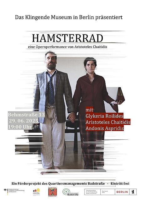 Die Opernperformance von Aristoteles Chaitidis zeigt zwei Menschen, die in der Routine ihres Alltags gefangen sind. In diesem Hamsterrad durchbricht die Musik als Erlösung und Gegengewicht die Allmacht des Alltags. Eine Sopranistin und ein Countertenor wagen den Versuch einer Revolte. Der Eintritt ist kostenlos, Spenden sind erwünscht. Das Projekt wird durch den Aktionsfonds des Quartiersmanagements Badstraße gefördert.
