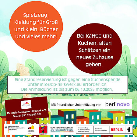 Wenn die Tage kühler werden, ist Zeit zum Aufräumen und Tauschen. Der Kinder- und Familienflohmarkt lädt ein, gut erhaltene Kleidung und Spielsachen weiterzugeben. Auf dem Kinder- und Familienflohmarkt gibt es dazu die Gelegenheit: Vorbeikommen, handeln, Kuchen essen und ins Gespräch mit den Nachbarn kommen erwünscht.
