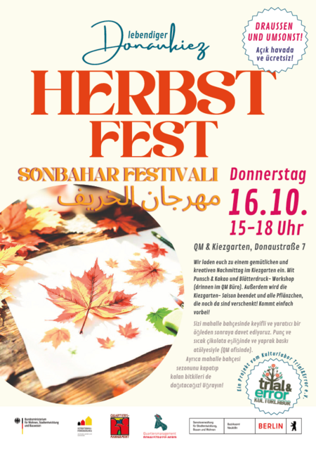 Das Herbstfest lädt dazu ein, den Kiezgarten gemeinsam in die Winterpause zu verabschieden. Besucherinnen und Besucher können Pflanzen mitnehmen, basteln und sich an einer Sauberkeitsaktion beteiligen, bei der eine neue App getestet wird. Dazu gibt es herbstliche Snacks, Getränke und die Gelegenheit, mit Nachbarinnen und Nachbarn ins Gespräch zu kommen.