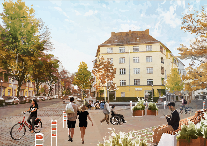 Konkret sieht das so aus: Als Einfahrtsperren oder auf Kreuzungen diagonal aufgestellte Poller (Diagonalsperren), Tempolimits oder Einbahnstraßenregelungen verhindern oder / und entschleunigen den oft zu schnellen Durchgangsverkehr im Kiez, der dort zuvor zu Lärm- und Luftbelastungen sowie zu Unfällen führen konnte. Radverkehr bleibt weiterhin möglich. Bei der Verkehrsberuhigung in Form von Kiezblocks werden auch Parklets aufgestellt. Parklets sind meist begrünte Sitzgelegenheiten auf Parkpätzen, die neue Möglichkeiten für Aufenthalt und Begegnung eröffnen können. Durch den reduzierten Verkehr werden Umweltbelastungen sowie Gefahren reduziert. Insofern tragen funktionierende Kiezblocks durch eine CO2-Minderung zum Klimaschutz, zur Sicherheit und zu mehr Umweltgerechtigkeit bei. Sind eingesetzte Parklets überdacht, bilden sie außerdem beschattete Aufenthaltsräume im Sinne der Klimaanpassung.